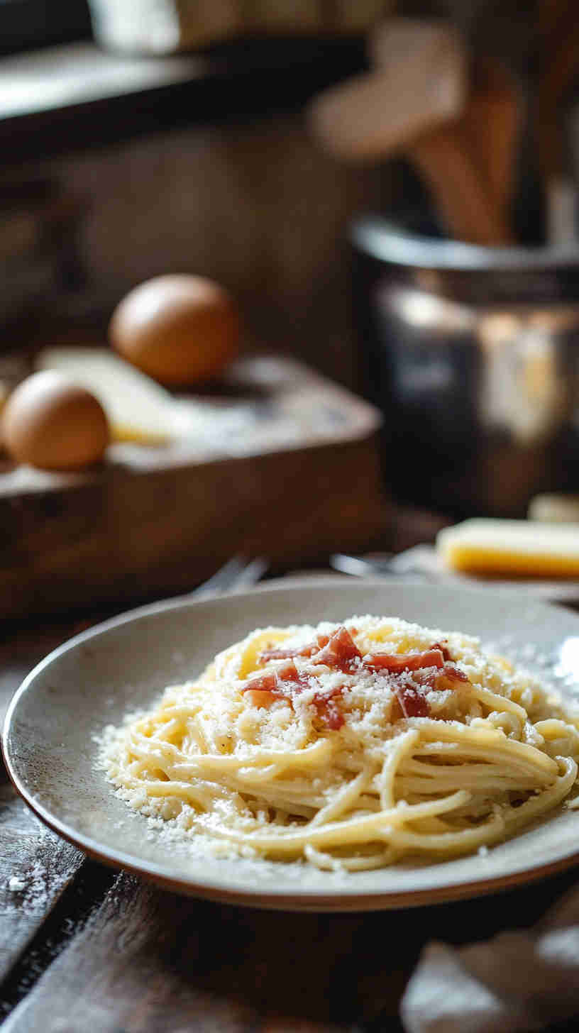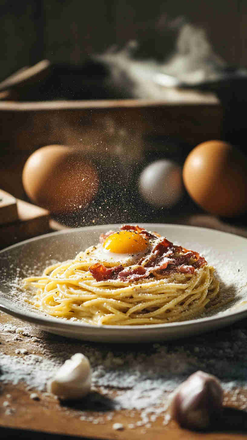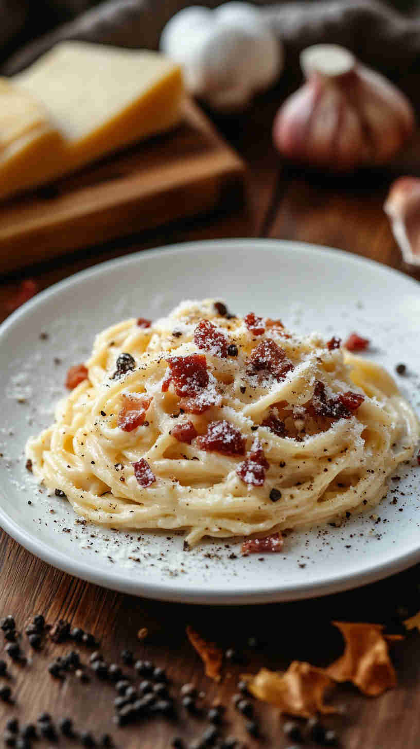 Carbonara is best enjoyed immediately while hot and creamy—reheating can cause eggs to scramble or sauce to separate. If leftovers occur, store in an airtight container in the refrigerator for up to 1-2 days. To reheat, place in a skillet over very low heat, add a splash of water or reserved pasta water, and stir gently until warmed through (avoid microwave to prevent curdling). Freezing is not recommended, as it ruins the sauce texture.