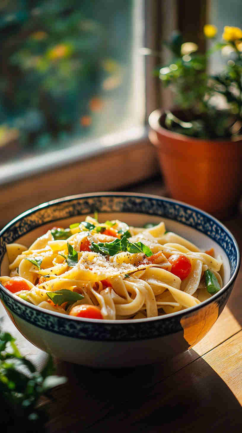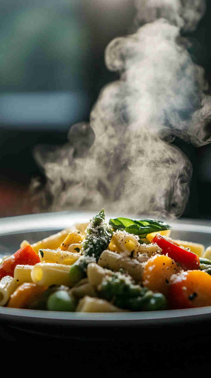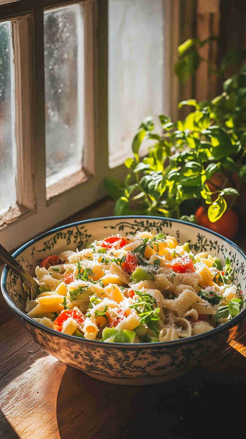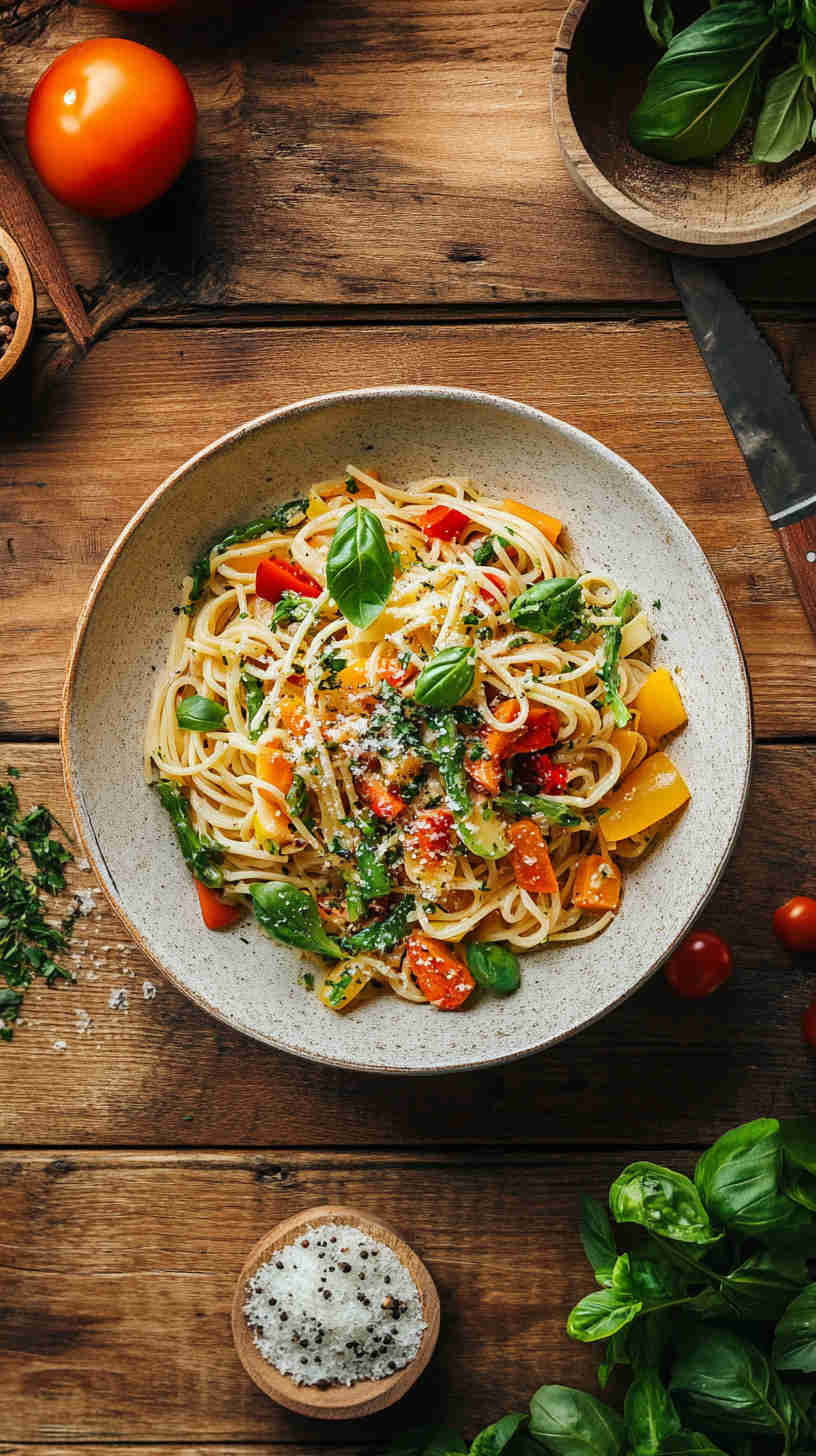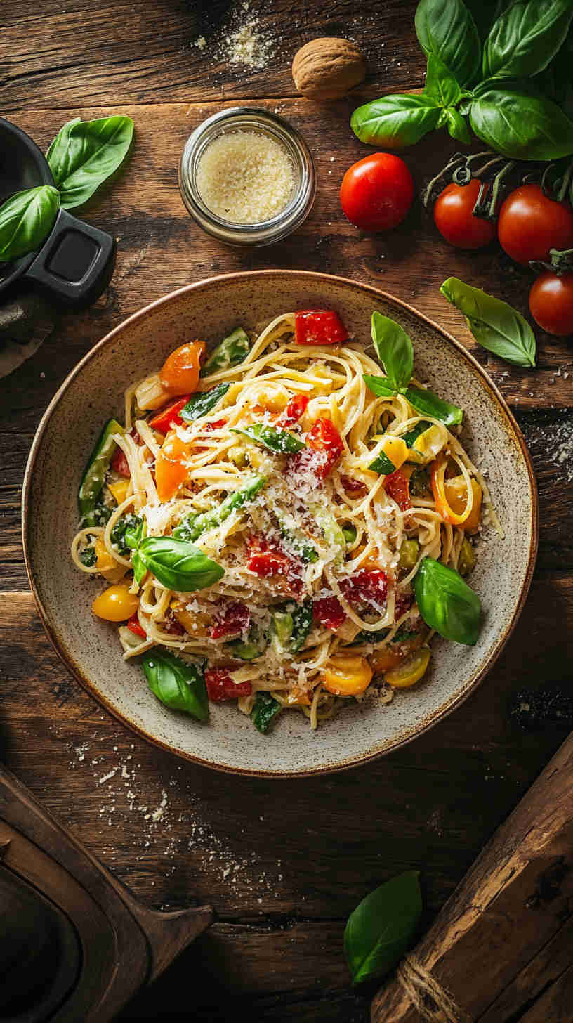 Fresh garlic and lemon add aromatic brightness and acidity. Penne or farfalle pasta works perfectly as it holds the sauce well. Vegetables like asparagus, zucchini, yellow squash, bell peppers, cherry tomatoes, and peas are seasonal stars—opt for crisp, vibrant ones. Fresh basil and parsley bring herbal freshness, while grated Parmesan (or Pecorino) adds a nutty, salty finish. Use kosher salt and freshly cracked black pepper for seasoning to taste.