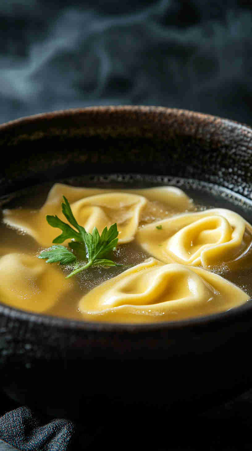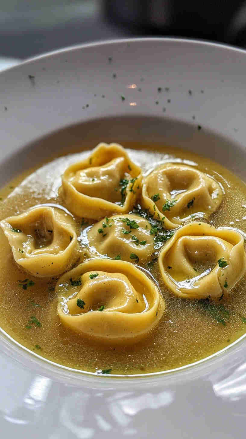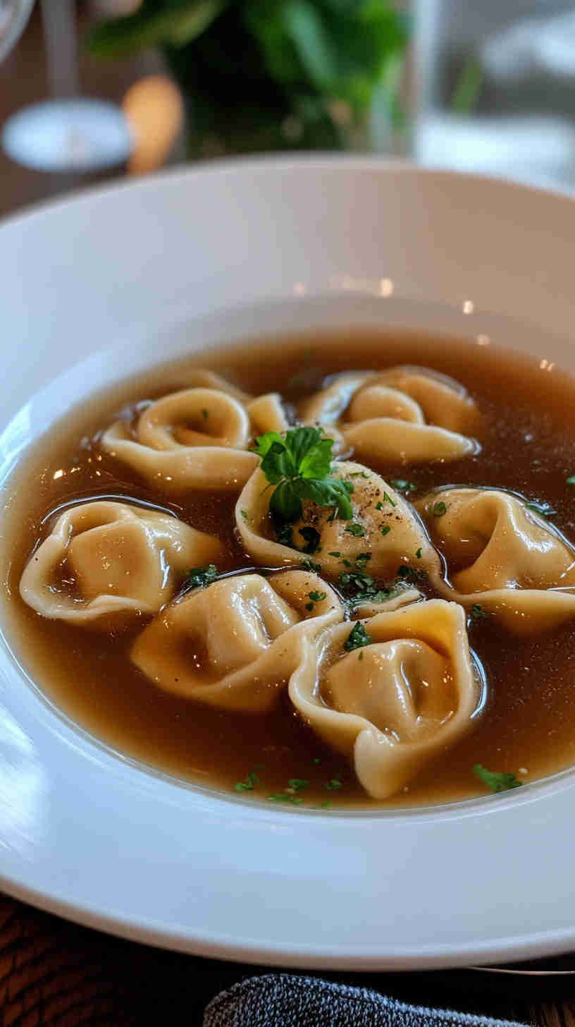 Tortellini in Brodo is a timeless Italian classic from Bologna, featuring delicate handmade egg pasta pockets stuffed with a savory blend of pork, prosciutto, mortadella, and Parmigiano-Reggiano, gently simmered in a rich, clear homemade broth. This comforting soup shines as a holiday starter, offering warmth and elegance in every spoonful.