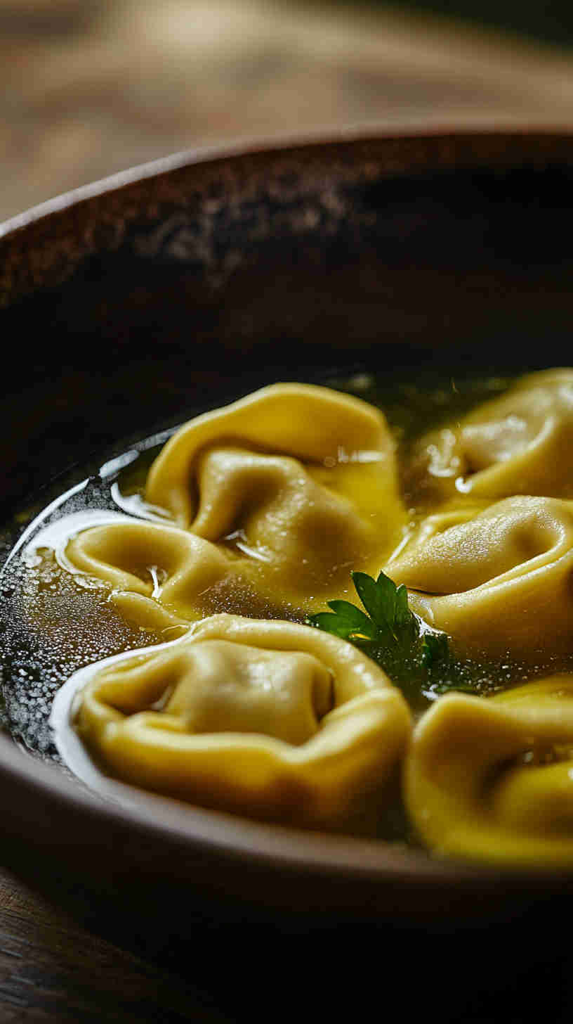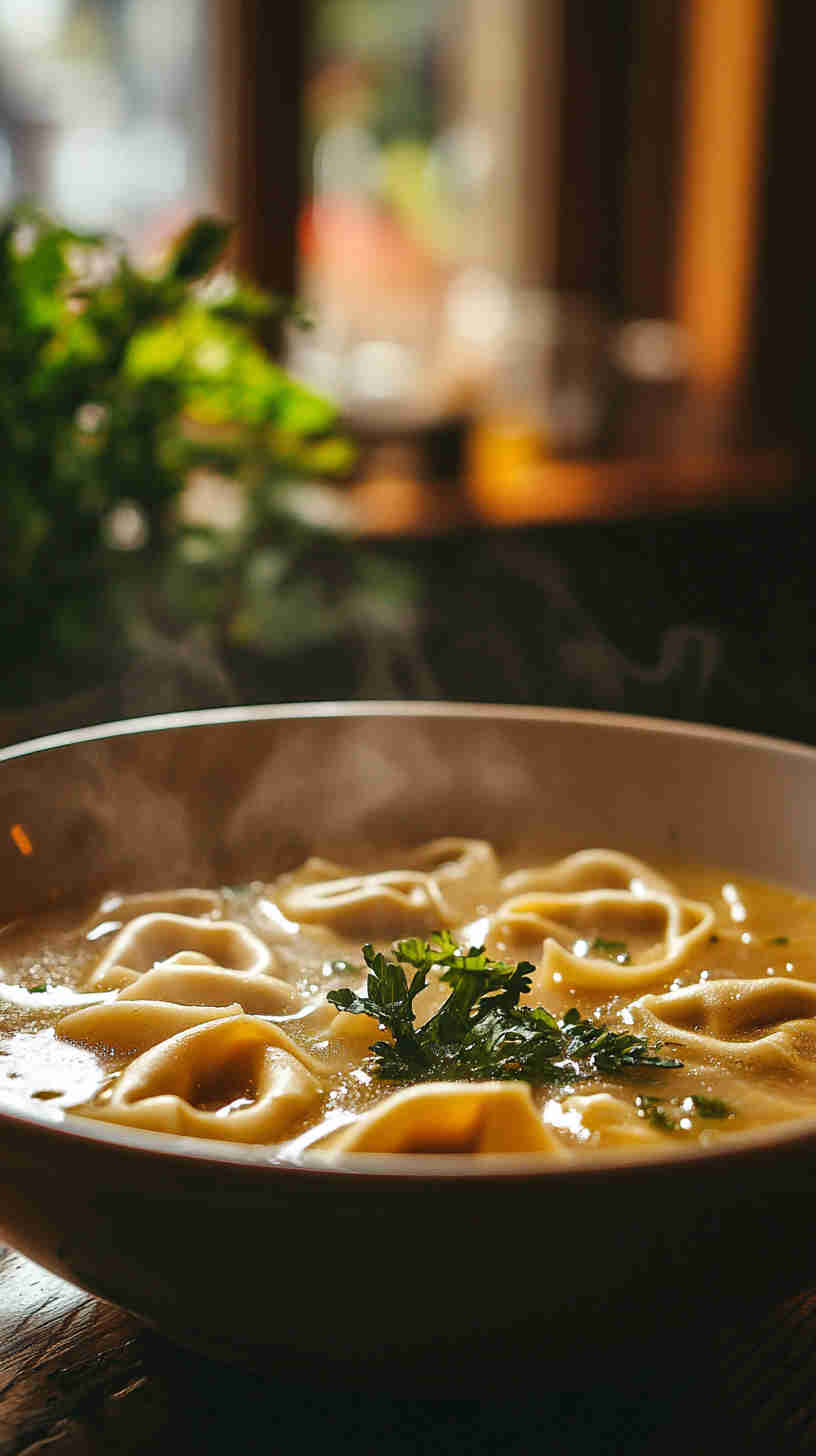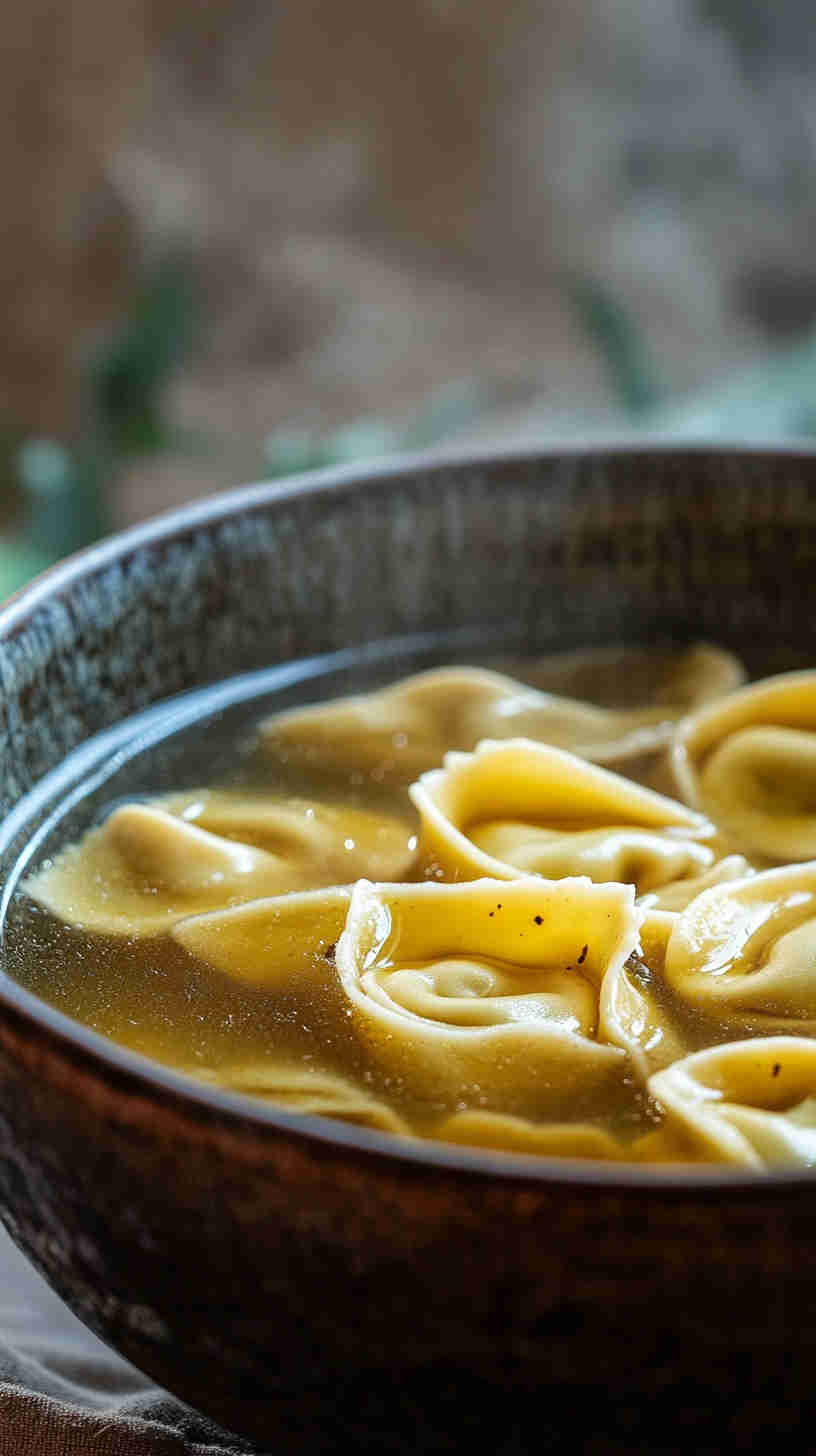 Tortellini in Brodo is a timeless Italian classic from Bologna, featuring delicate handmade egg pasta pockets stuffed with a savory blend of pork, prosciutto, mortadella, and Parmigiano-Reggiano, gently simmered in a rich, clear homemade broth. This comforting soup shines as a holiday starter, offering warmth and elegance in every spoonful.