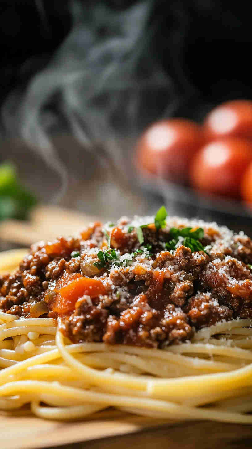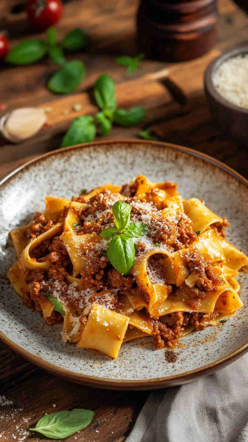 This classic Pappardelle with Bolognese Sauce features wide ribbons of egg pasta tossed in a rich, slow-simmered ragù alla bolognese made with ground beef, pork, pancetta, aromatic vegetables, milk, and wine. The hearty, velvety sauce clings perfectly to the pasta for an authentic Italian comfort meal.